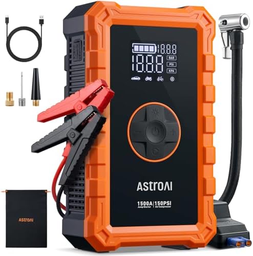 View full detailsAstroAI S8 Air Jump Starter with Air Compressor, 1500A Peak Car Battery Jump Starter Portable (6.0 Gas/3.0L Diesel) with 150PSI Cordless Auto-Shutoff Tire Inflator, 12V Battery Charger Booster(Orange)
